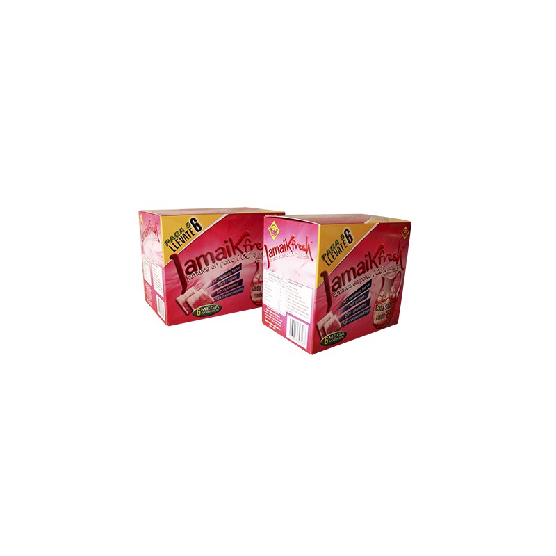 Caja con Jamaikfresh 2l, 6 sobres. Contenido Neto: 48pz de 150g c/u.